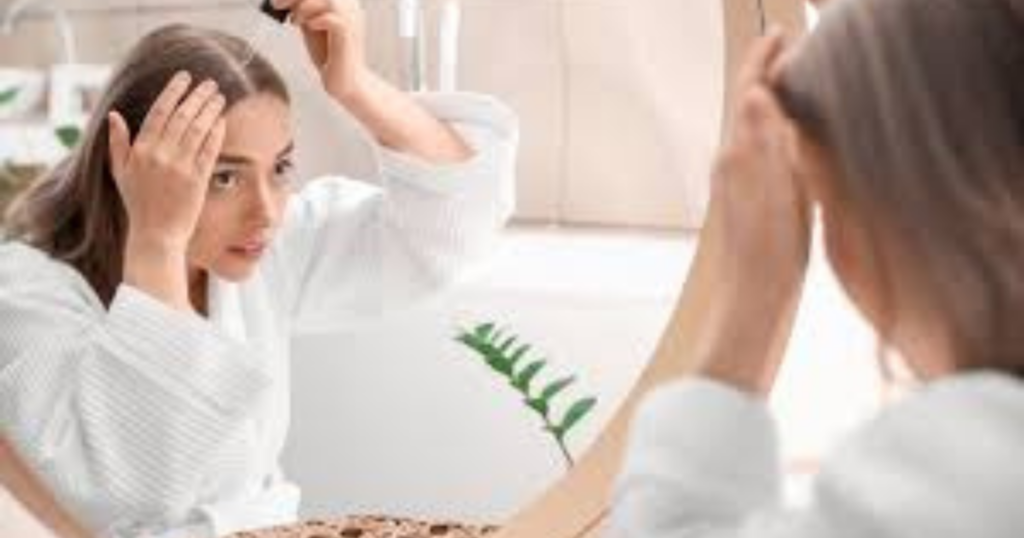 - Vaporiser l’Huile sur le Cuir Chevelu : À l’aide d’un vaporisateur, appliquez l’huile directement sur le cuir chevelu. Concentrez-vous particulièrement sur les zones où la perte de cheveux est plus importante, comme les tempes ou le sommet de la tête.