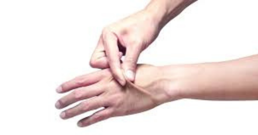 - Pincer une zone de la peau (souvent le ventre ou le dos de la main)