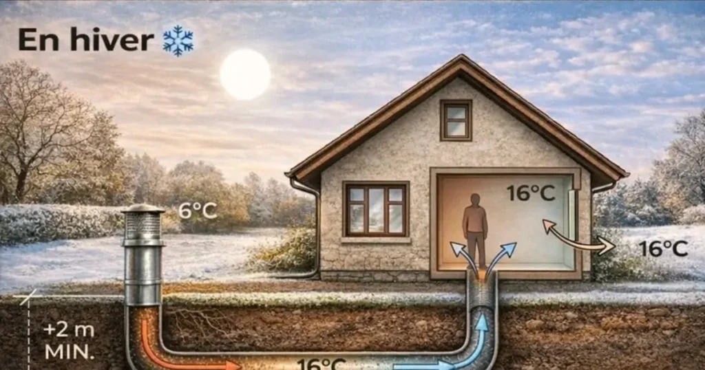 Le principe est simple : l’air extérieur circule dans ce conduit avant d’entrer dans l’habitation. Durant ce trajet, il échange progressivement de la chaleur avec le sol, ce qui permet de le rafraîchir en été et de le réchauffer en hiver.