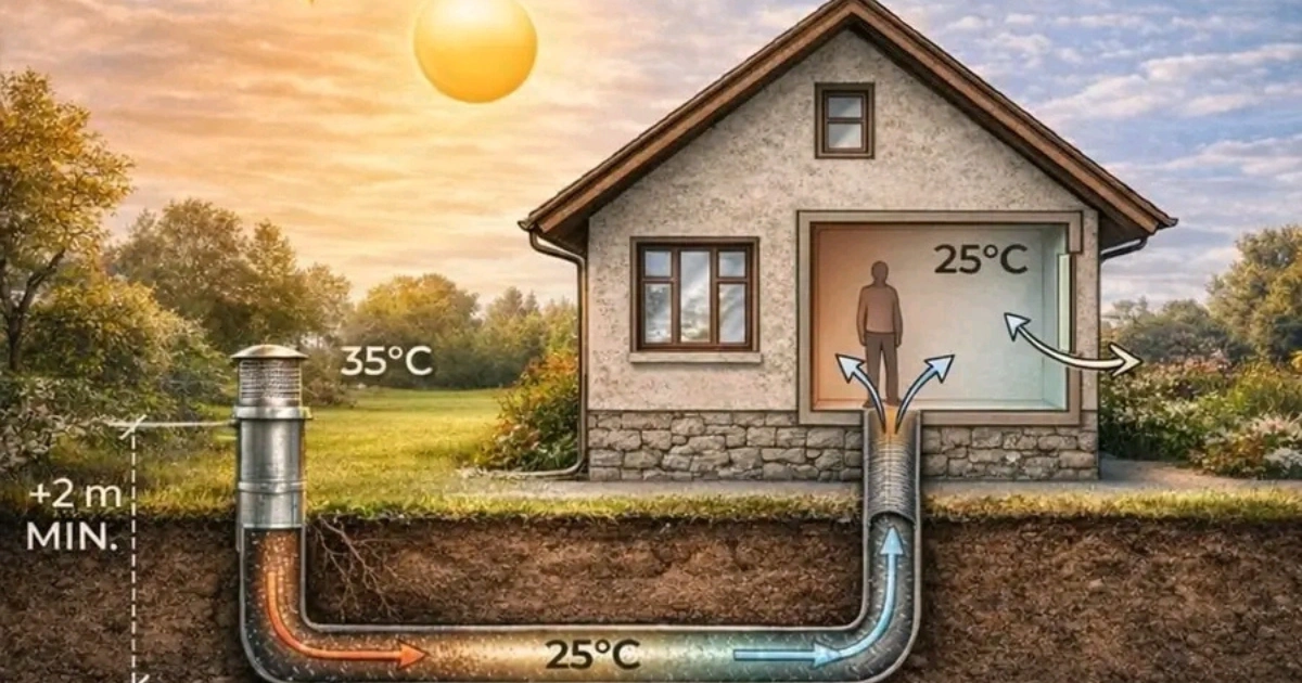Un tunnel d’air enterré est un conduit installé sous terre, généralement entre 1,5 et 2,5 mètres de profondeur. À cette profondeur, la température du sol reste relativement stable toute l’année, souvent comprise entre 10 et 14 °C selon les régions.